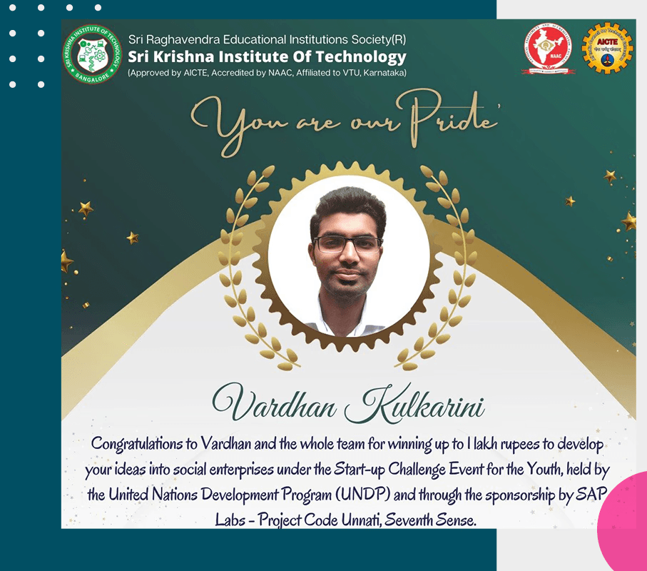 Final year student Vardhan Kulkarni secured first place and won 1 lakh rupees cash prize at the United Nations Development Program (UNDP) Start-up Challenge Event for Youth, showcasing innovative entrepreneurial solutions for social impact.